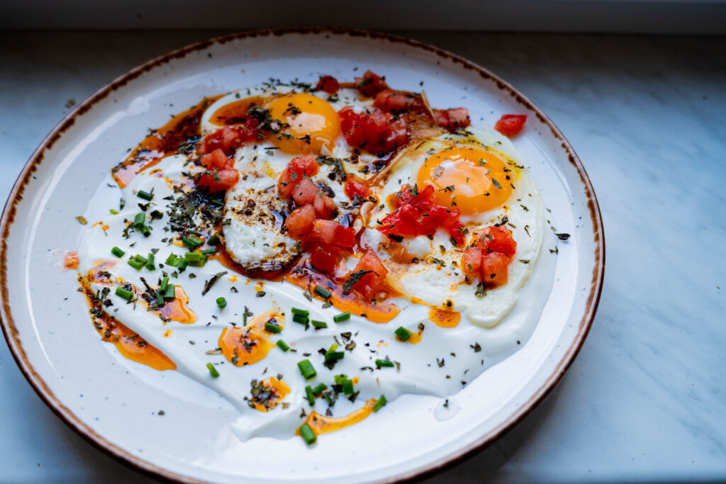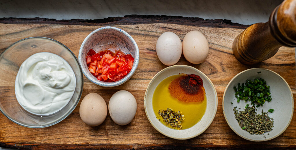 Jajka posypujemy pokrojonymi w drobną kostkę pomidorami, całość przyprawiamy suszoną miętą oraz niewielką ilością szczypiorku.