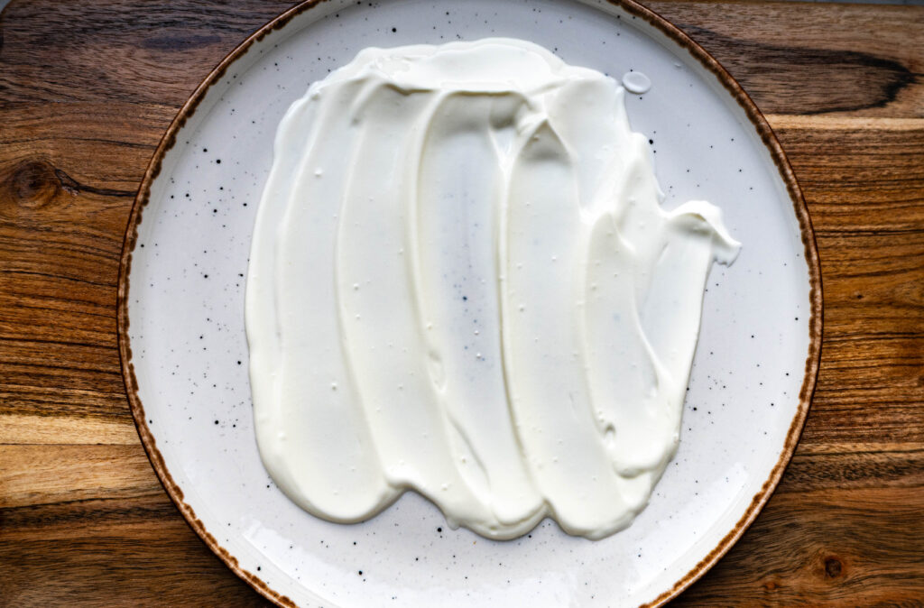 Dodajemy świeżo zmieloną sól do jogurtu greckiego, całość mieszamy. Następnie jogurt rozsmarowujemy na talerzu.