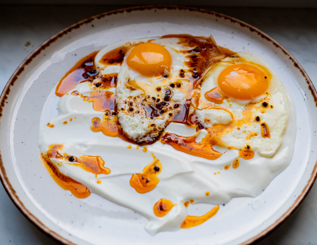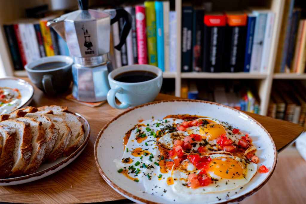 Śniadanie gotowe! Najlepiej smakuje ze świeżym, chrupiącym pieczywem oraz gorącą kawą.