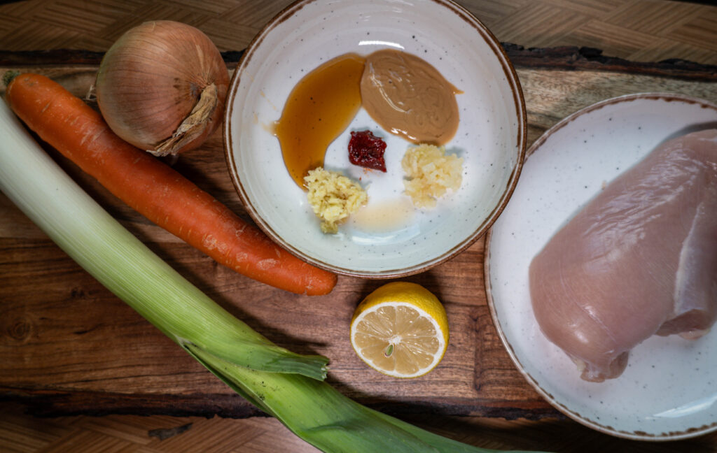 - Do marynaty potrzebne będą: imbir (około 2-3 cm startego na tarce), 2-3 ząbki czosnku, łyżeczka pasty gochujang/ostra papryka (pasta jest ostra, uważajcie z ilością i najlepiej dostosujcie ją do swoich preferencji), łyżka oleju sezamowego, łyżka sosu sojowego, łyżka masła orzechowego. Czosnek przeciśnijcie przez praskę i wymieszajcie z pozostałymi składnikami. Gdy marynata będzie gotowa, połączcie ją z kurczakiem.