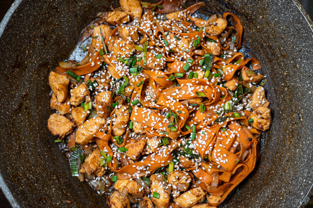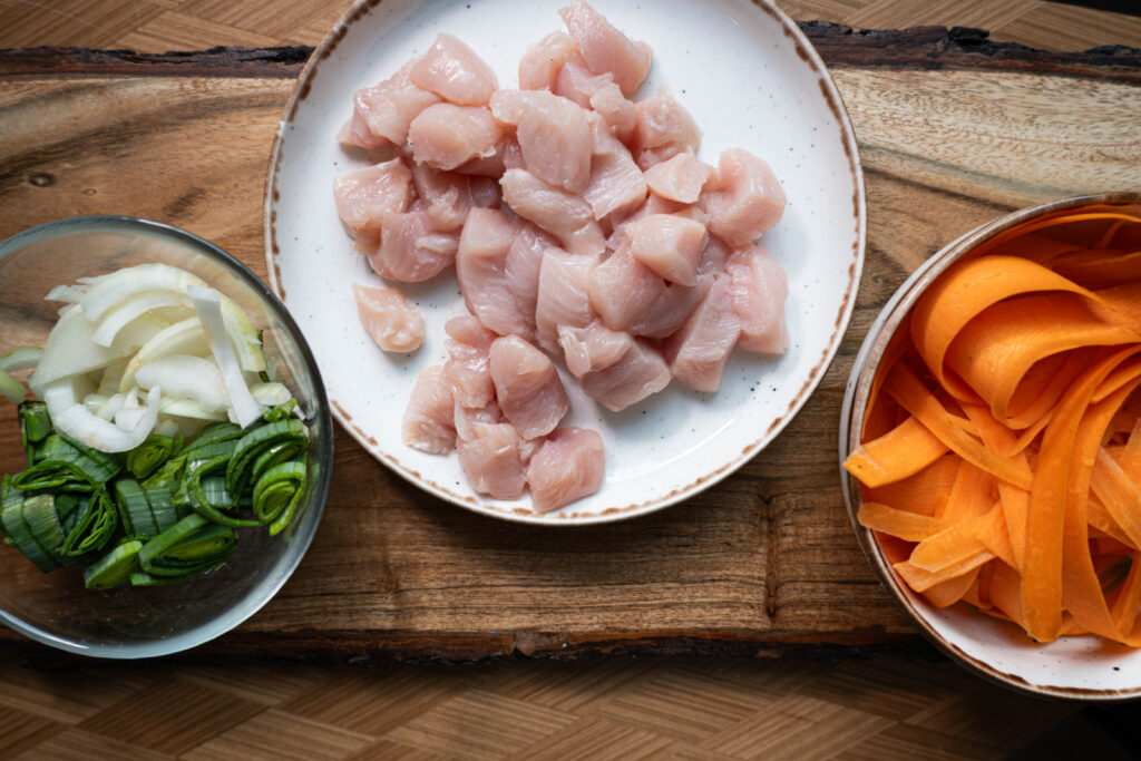 - Na tą samą patelnie wrzućcie warzywa – marchew, por i cebulę. Gdy się zarumienią, dodajcie do nich kurczaka i podsmażajcie do momentu połączenia się wszystkich składników.
