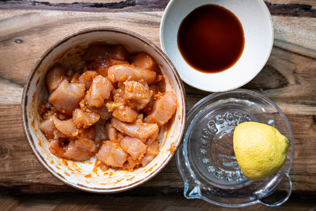 - Pokrójcie kurczaka w kostkę, odstawcie na bok i zacznijcie przygotowywać marynatę.
