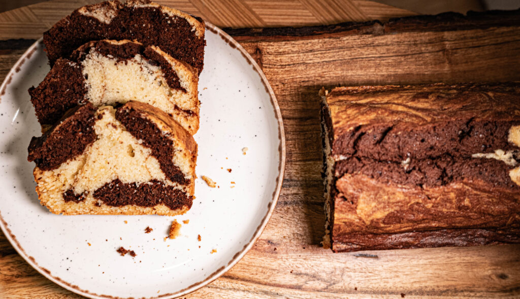 Formę do pieczenia smarujemy masłem, delikatnie oprószamy mąką. Ciasto do formy wkładamy na zmianę warstwami, raz jasną, raz ciemną masę – powtarzamy na całej długości formy. Po włożeniu całości ciasta do formy robimy widelcem albo patyczkiem zygzaki, które mają za zadanie zrobienie czekoladowych, marmurkowych wzorów.